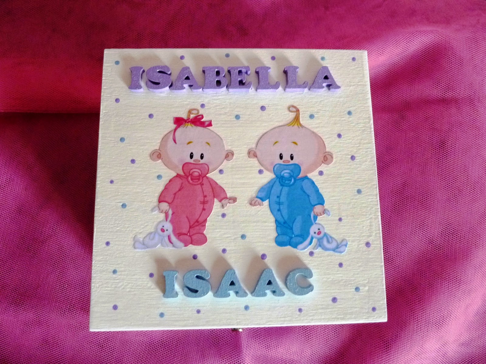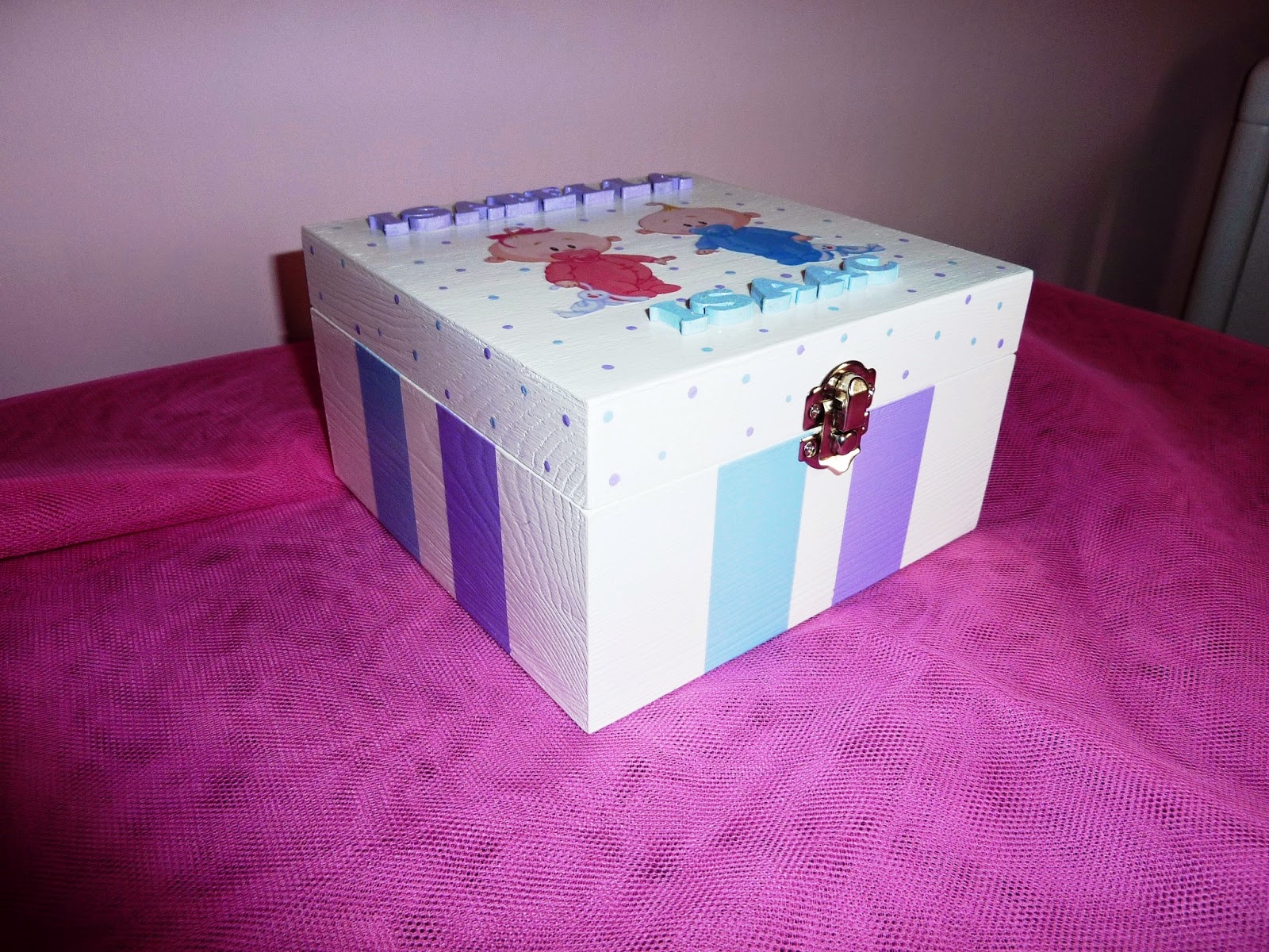 A caixa é pintada manualmente em branco, com riscas e bolinhas azul claro e violeta e découpage de um desenho com uns manos gémeos, menina e menino - o pedido da mamã era que tivesse azul claro e branco!