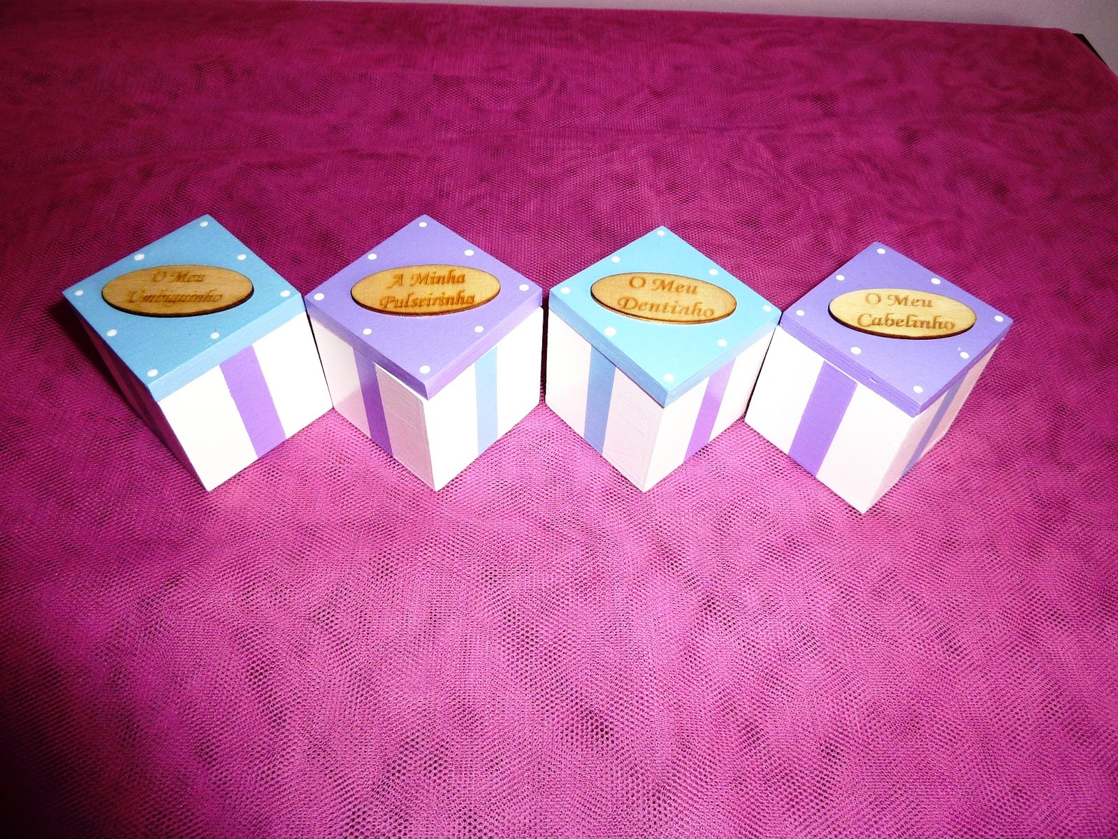 As quatro mini caixas foram pintadas a contrastar - as duas com riscas azuis têm tampa violeta e as duas com riscas violeta com tampa azul.