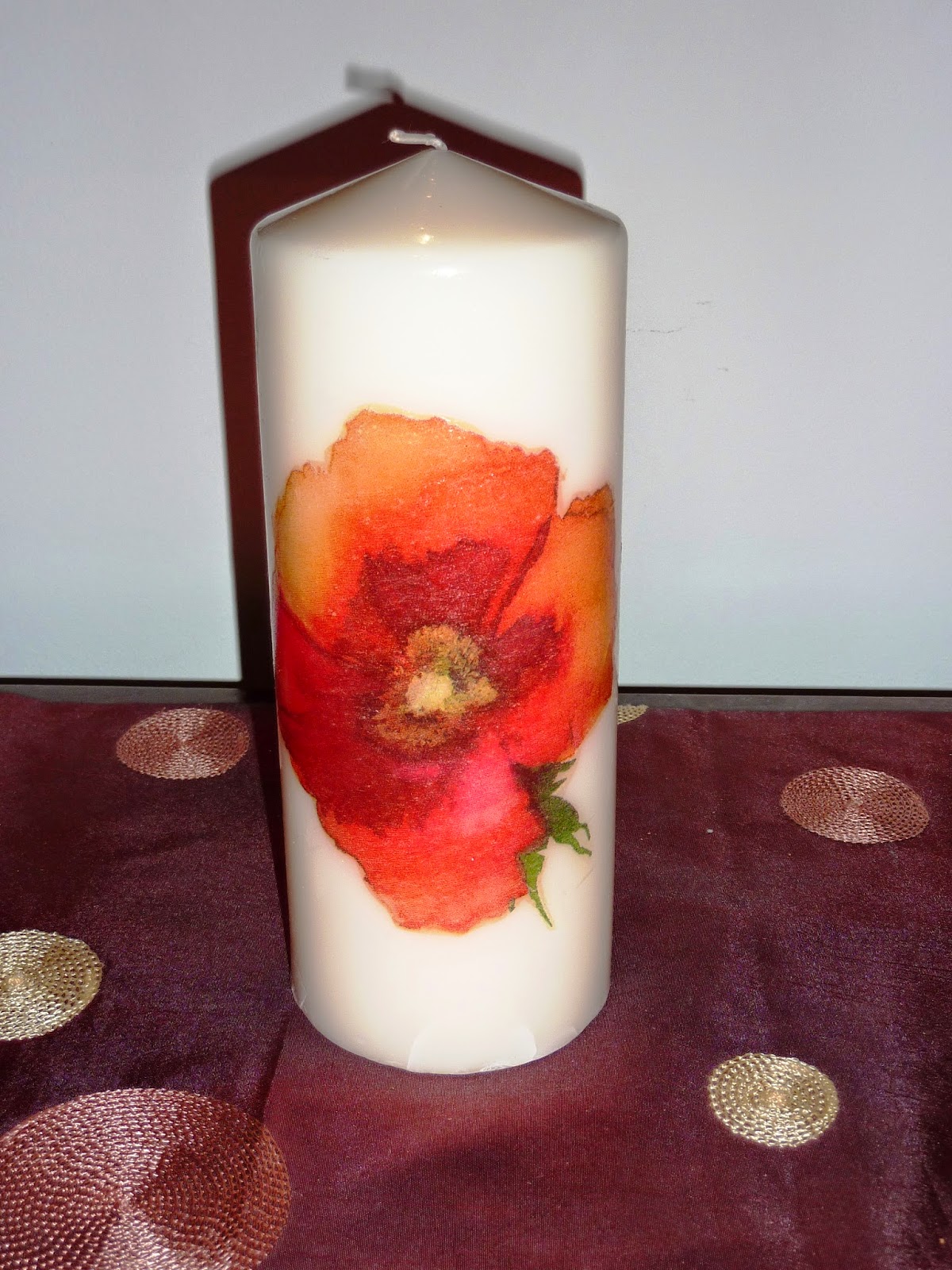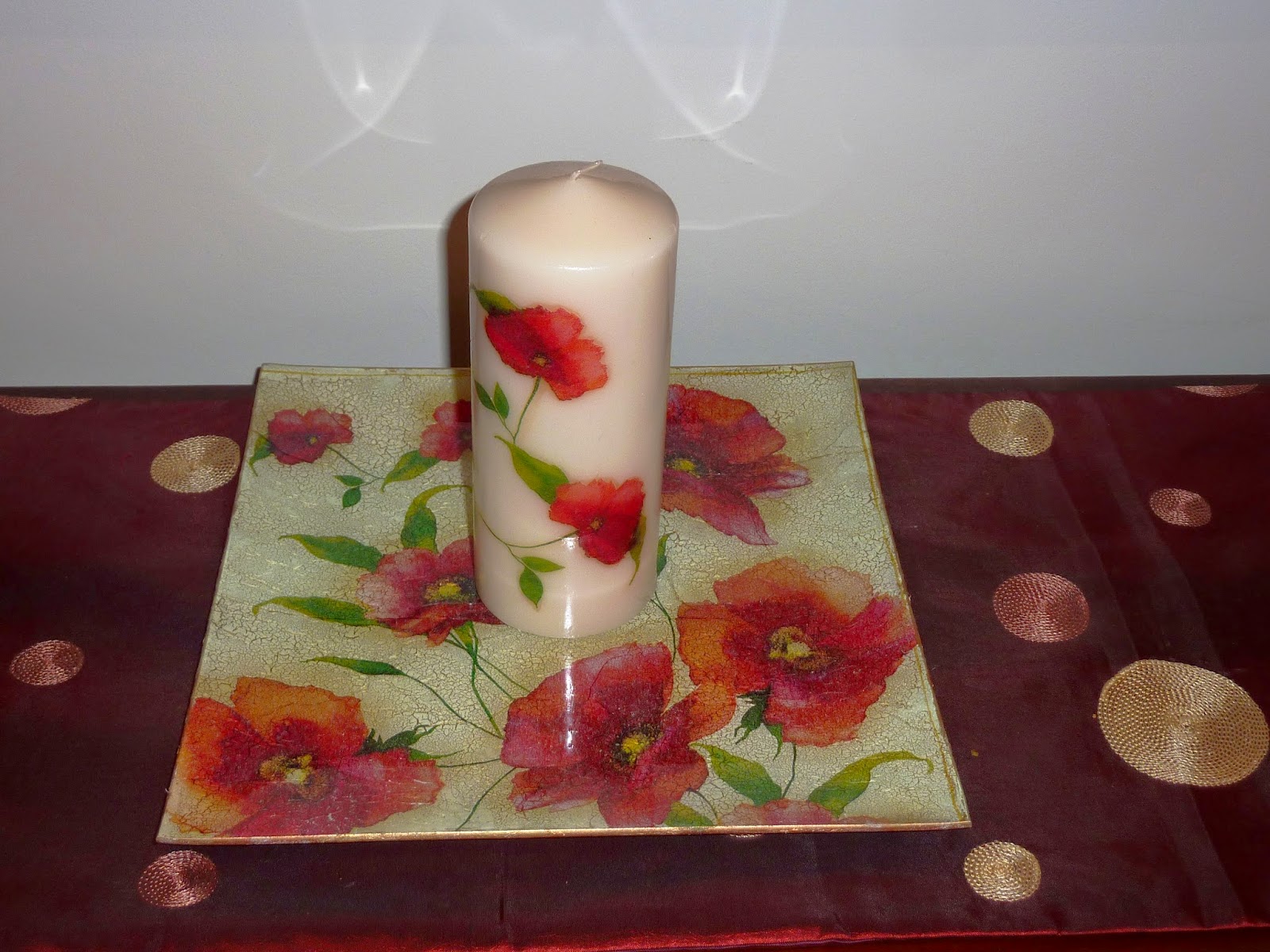 Ficam as prometidas fotos dum lindo prato de vidro quadrado, tamanho 33x33, decorado com découpage de papoilas e craquelê, que faz conjunto com uma vela grande também com papoilas!