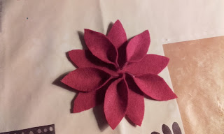 1- Recortar o molde da Poinsetia, copiar para o feltro e recortar o feltro. Para cada flor são necessárias uma base e cinco pétalas;