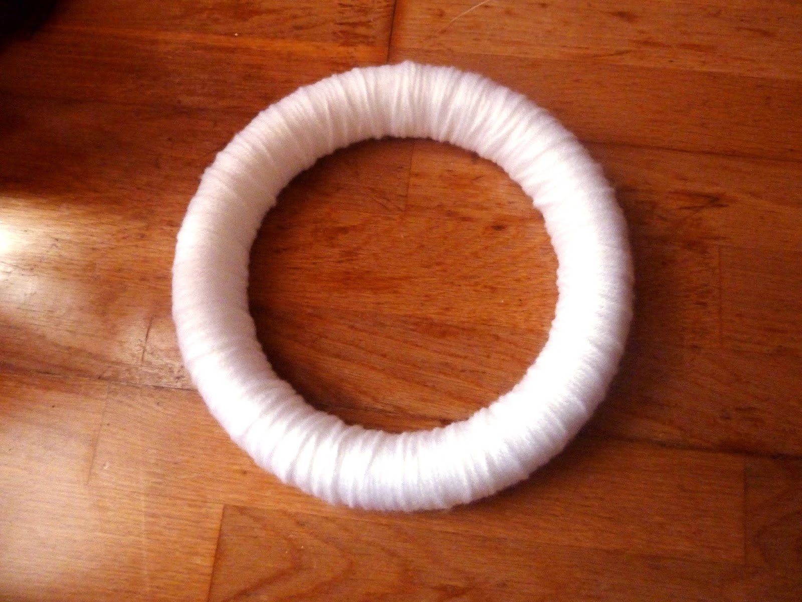3 - Depois das flores feitas inicia-se a personalização da coroa de esferovite. Vai-se enrolando com a lã branca em volta da coroa até a preencher completamente.