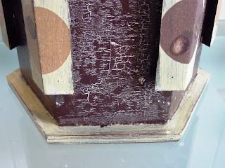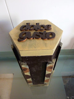 Pintura manual com craquelet (onde se colocam as cápsulas) e pintura de pátine provençal (na tampa e base) para dar um efeito rústico e antigo à peça! Acabamento em découpage de círculos com grãos de café e verniz!