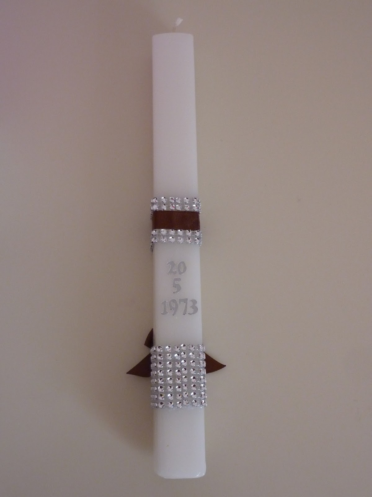 Entendi que a vela de Crisma, para uma pessoa adulta, teria de ser simples e sóbria e que o castanho ficaria lindo com strass prateado!