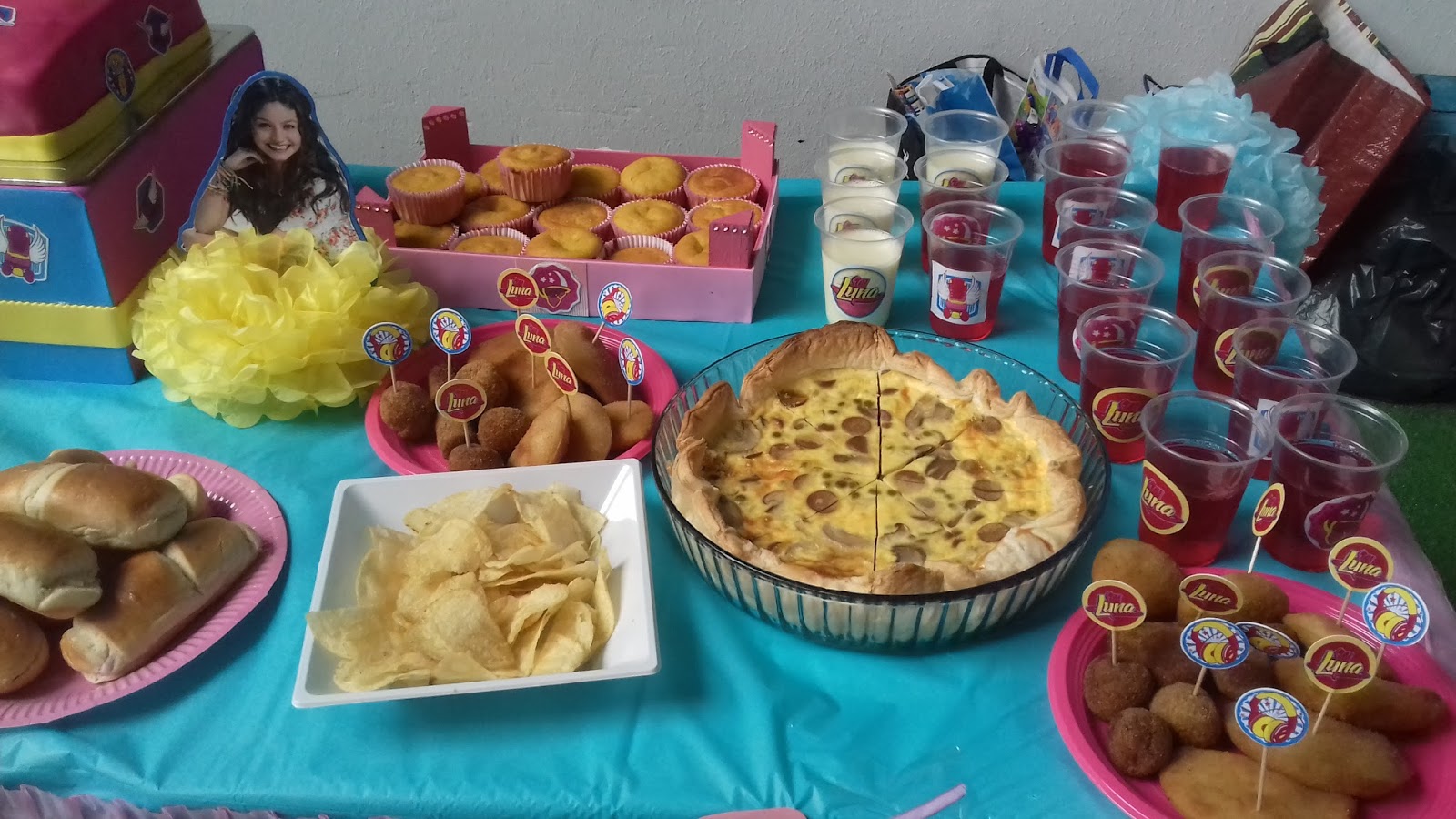 Decorei a mesa do bolo com uma toalha azul clara e um saiote de mesa rosa, os cupcakes foram colocados numa caixa de morangos reciclada e num centro de mesa feito em EVA, as latas recicladas foram pintadas de rosa e azul e aplicaram-se imagens da Soy Luna para os talheres, os frascos de vidro reciclados com imagem com a foto da Luna, o Patim em 3D com indicação do nº de aniversário, o banner de parabéns ...